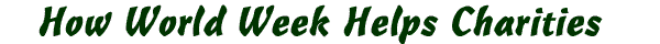 World Week is an exciting educational program that encourages understanding and raises awareness of important global issues - health, education, environment, justice and peace - and helps people suffering from disease, hunger, human rights abuses, violence and environmental devastation through participating charities.World Week can be an excellent component of a charity's advocacy, development education, media relations and communications programs. Materials and activities can be customized for specific charitible organizations. World Week activities and educational materials take a fresh look at some of the toughest issues the world faces today. World Week participants choose educational materials and activities related to issues that interest them - hunger, education, disease, gender discrimination, AIDS, water, environment, war and other related topics. Helping Charitible Organizations Tell Their StoriesWorld Week subsidizes trips to document charitible organizations' work in developing countries. For more information on how World Week can help your organization, contact us by e-mail or call (800) 585-3636.